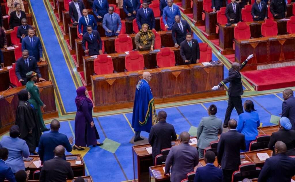 President Samia Suluhu Hassan enters the debating chamber to address the august House, marking the inauguration of the 13th Parliament in Dodoma yesterday.